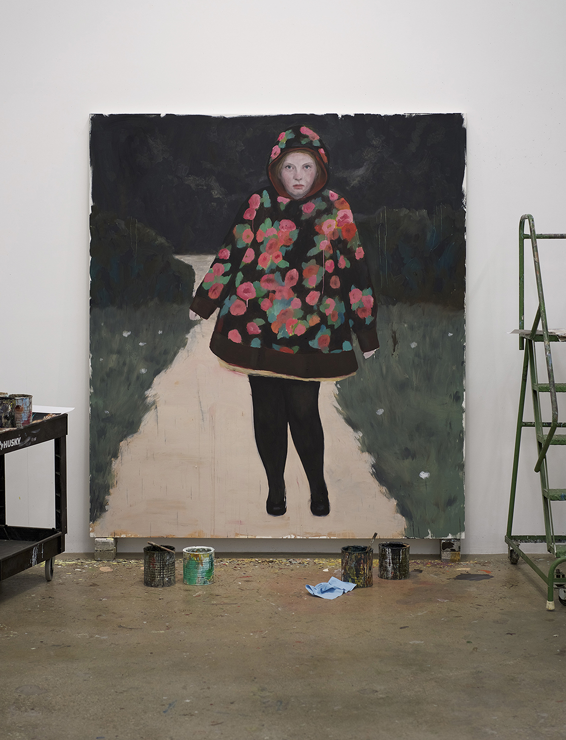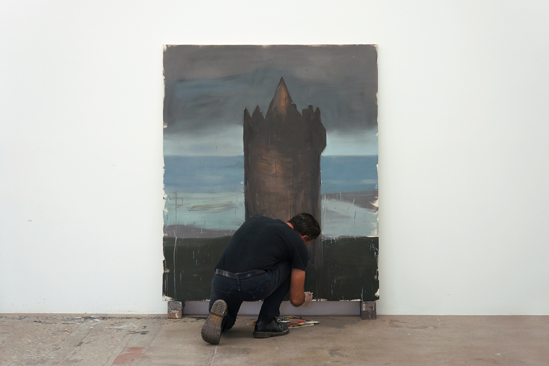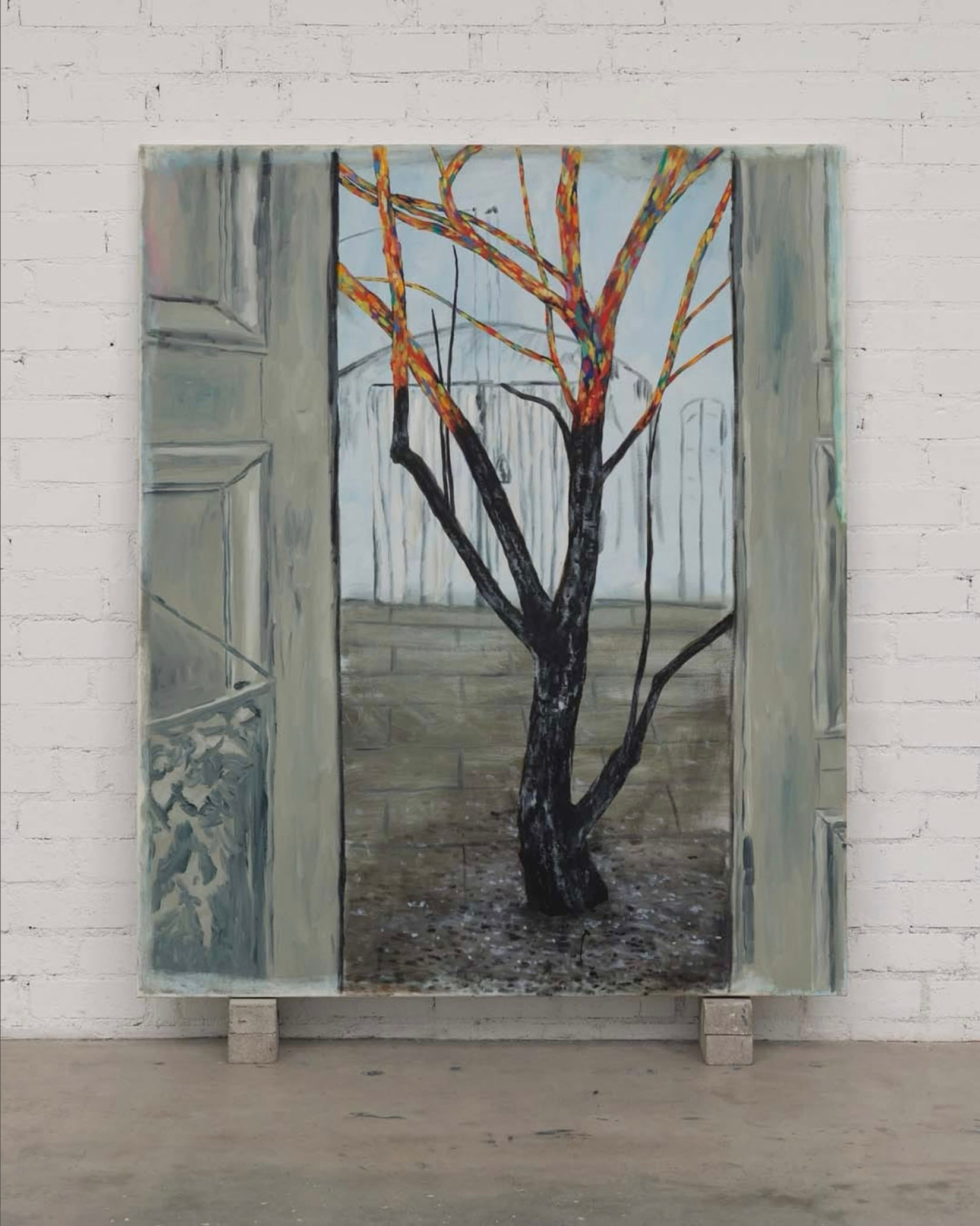 I’m interested in charged fragments with some narrative explosion ticking inside them, but not in storytelling or ready-made myths, because I don’t think they have much to do with the power of a work of art. So, I don’t like to talk too much about images, which is always the easy place to go for representational work. However, it seems worth mentioning that for this exhibition, I’ve worked with interiors and the idea of the artist, which are not typical in my work. Houses, buildings, stairs, partly open doors at the cusp of an event. For the first time, I’ve been concerned with painting the artist, a reflexive gesture that attends to the one who gives attention, which in our day-to-day efforts amounts to desperately trying to use the fleeting time life offers to grasp the ungraspable. Maybe the most consequential aspect of the artist’s work is the effort to find significance amid impermanence.