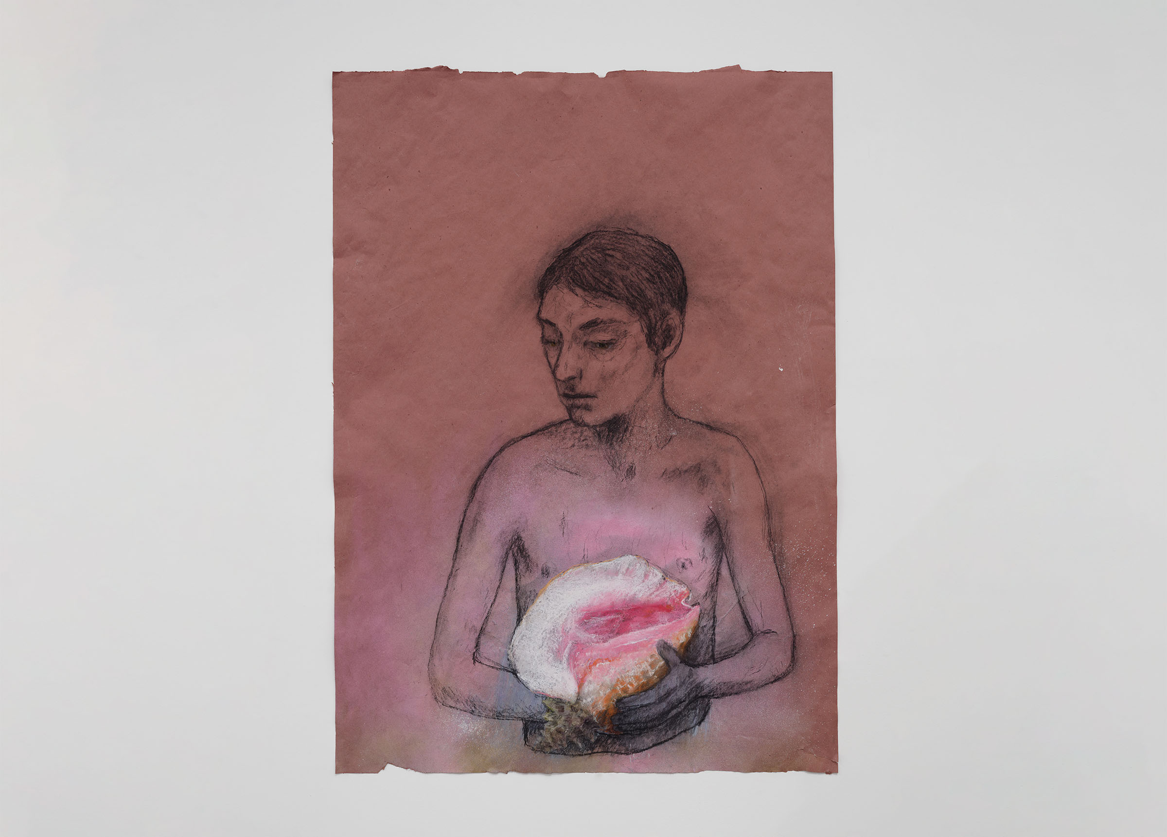 "Here to Kneel, Voyagers" the exhibition I have created for Patricia Low Contemporary, continues to explore and expand the territory suggested by those two previous projects. This body of work integrates nuanced observations of transitory experiences with enduring concerns, such as redemption, memory, time, myth, and nature. The paintings and works on paper bring together complete and incomplete parts, where painted figurative details and images of nature coexist with sketchily drawn—often in charcoal—seas, architectural references, words, or lines of my poems. Aspects of these works are characterized by images with uncanny or charged allusions and poetic language, while other aspects seem incomplete or silenced. I am trying to extend the boundaries of language, images, and of the paintings themselves to articulate the unspoken as well as the unspeakable, in order to open a space for imagination and deeper emotional engagement with the artwork.