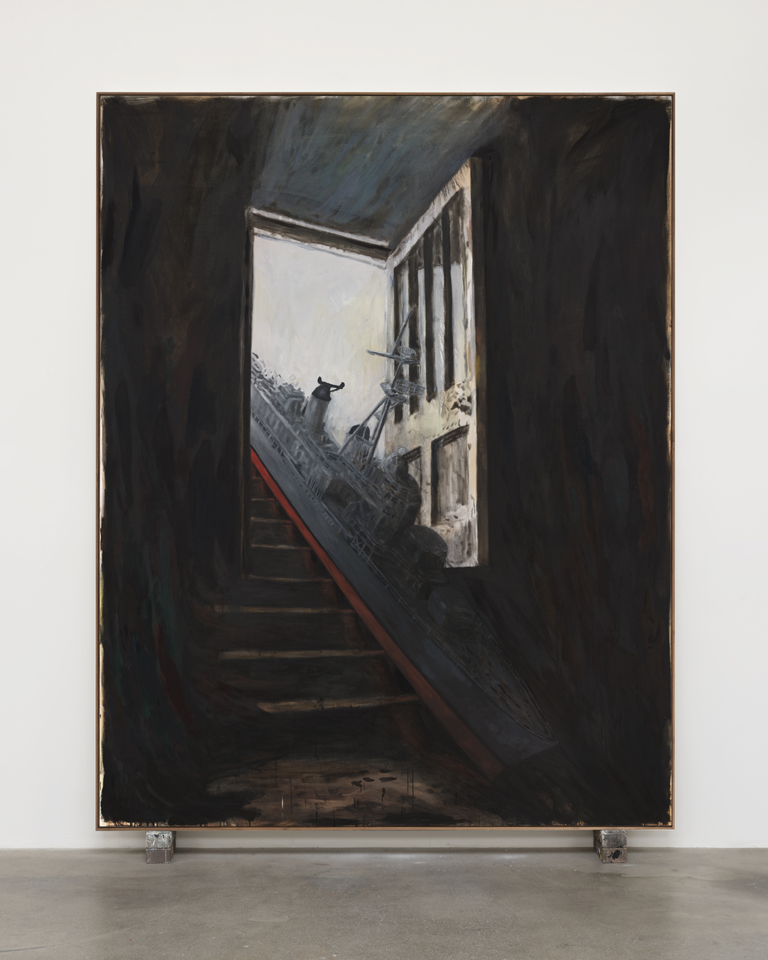 The access the open door could offer is something that it appears indifferent to. This door neither promises clarity nor comments on the darkness below. Its painted light is incidental, a reminder of the inaccessible and featureless outer world that contrasts with the basement’s restless shadows. The paint and the painting cannot resolve the contrast between the two spaces—the external and the internal, the lit and the darkened—and so, the battleship, like any object or feeling that’s brought into this room, becomes subject to the ambiguity of its surroundings. If this battleship belongs somewhere now, it is in the dark room where objects are held not as they are or as they hope to be, but as relics reshaped by shadows—haunted by a gnawing sense of banishment from a place barely remembered and bearing witness to mourning for what can never be released or fully accounted for.