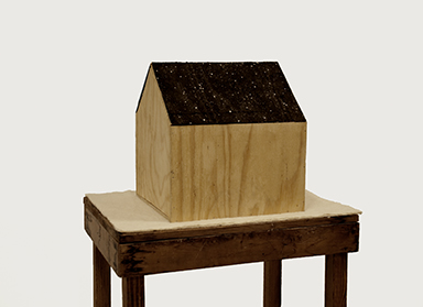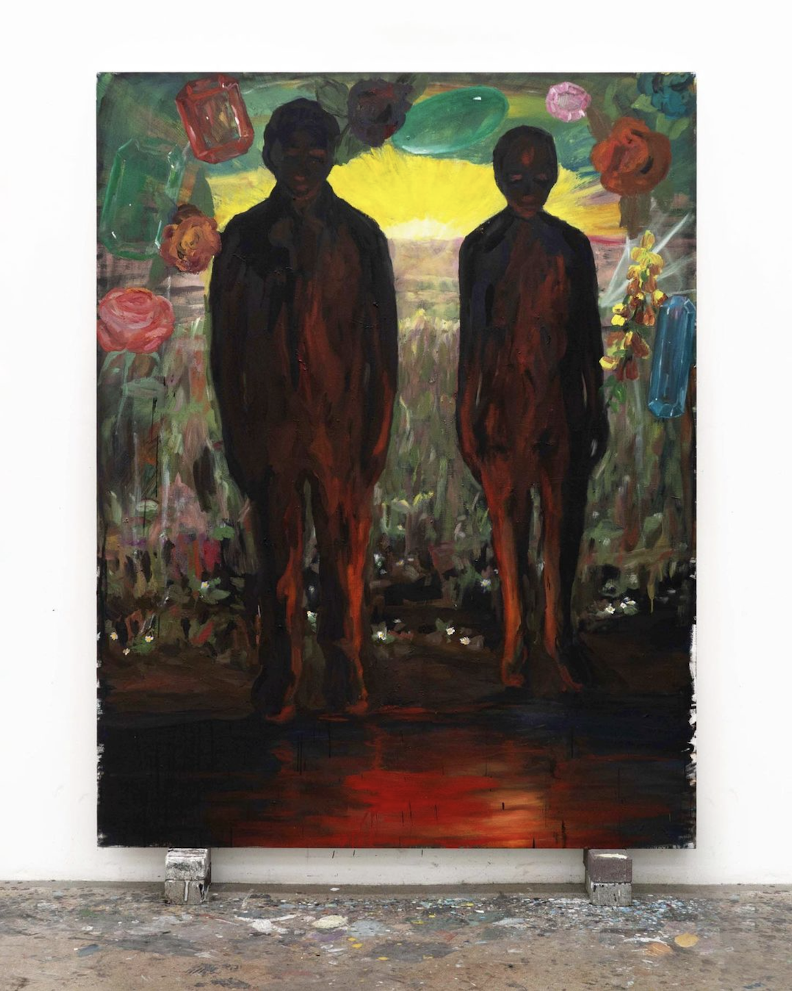 This is an environment consisting of four large paintings and a monumental sculpture, centered around the motif of an apple tree and incorporating references to fire, ice, night, and the exilic projection of a utopian home. This project is concerned with the innate drive for self-realization and the search for—and obstacles to—a meaningful life. While not explicitly about Robert Frost or his poetry, during the process of creating this body of work, I have considered elements from the poet's life and poetry to construct a narrative that transcends individual life specifics, engaging instead with existential, philosophical, and societal questions.