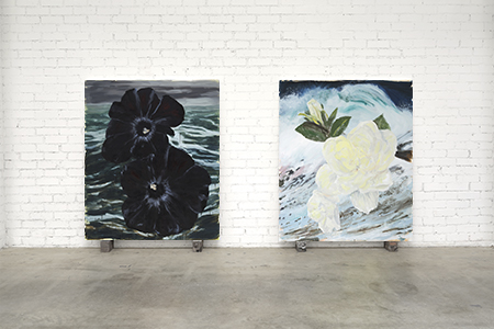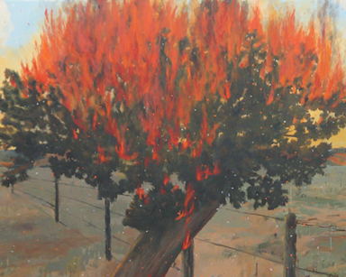 The four paintings present a cycle that begins with hope and ends in catastrophe and redemption, then starts again. The imagery invokes a lush harvest in winter, an orchard in the sky, a burned landscape, and an apple tree against an ominous ocean. The two figures that appear, a handless boy and a falling, burnt man, are both maimed, though in different ways and by different forces. The plane of night descends upon the room, dragging with it an uprooted apple tree—did the plane rip it out of the ground or merely transport it as such? My goal is for the dried-up apple tree to live again with the writings and poems visitors will clip to its branches. These writings will remain secret and, in this way, connect with Carol Frost’s unknown poems.